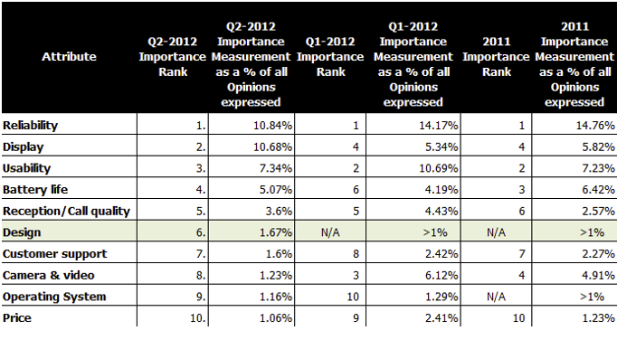由分析機構Amplified Analytics所做的調查顯示,用家對大屏幕的需求有增無減。據他們所做的統計知道,2011年及2012年第一季,屏幕大小的重要性仍然排在第四位,但今年第二季已經升到第二,重要性百分比由約5-6%提升至10.68%。耐用度雖然佔是用家心目中排行第一,但從數據亦亦可以發現,已經顯得沒有比往常重要,上一季仍然佔 14.17%,但第二季已經跌至10.84%,與屏幕大小的比例十分接近。