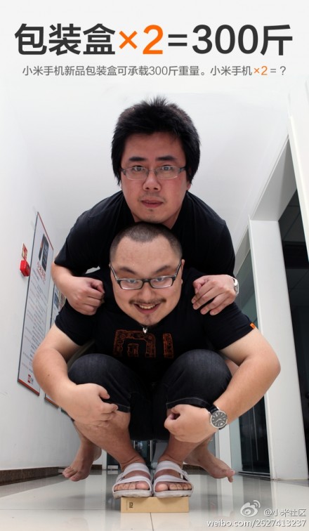 將發布的手機相信是盛傳採用高通APQ8064 1.5GHz四核處理器的M2,手機實際配置雖然未有披露,但產品包裝紙盒則已經公開,承襲M1包裝盒的簡約,承重力強的設計,M2手機包裝盒依舊用上簡約環保型包裝,但承重量則達300公斤,早前早前小米就上傳了兩名壯男層層疊站在包裝盒上的相片,以證明包裝盒的堅固度。