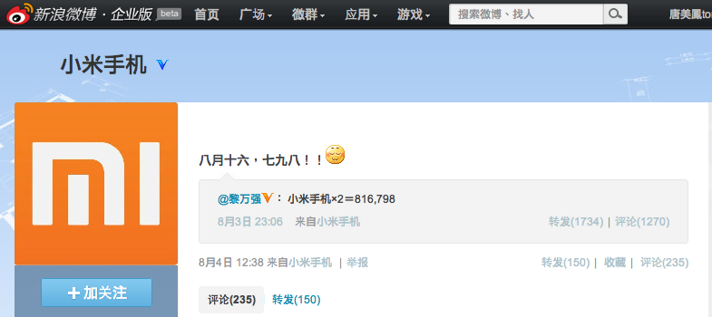 不少有注意中國品牌手機的讀者,對小米手機相信並不陌生,尤MIUI團隊自行設計推出的Android智能手機。小米科技副總裁黎萬強早前發布了一條微博,問網友「小米手機x2=?」,而創辦人雷軍則進一步發微博「小米手機x2=816,798」。小米手機的官方微博則寫明「八月十陸,七八九月!!」,有傳媒向小米手機查詢,公司發言人表示將會於8月16日在798藝術區發表新手機。