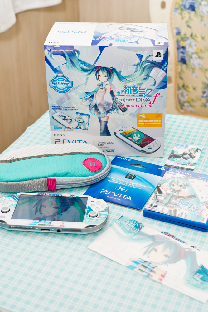 今次發布的限定版同梱裝,內有前早推出的晶瑩白 PS Vita 3G/Wi-Fi,機背印有初音未來圖案,還有原創設計屏幕保護貼、原創設計 AR 卡片、 湖水綠色的 Trooper Pack 主機包、4GB 記憶卡及《HATSUNE MIKU – Project DIVA-f 》 音樂遊戲,以 $3,488 定價發售。另外 Sony 也會推出下載版供現有玩家購買,定價為 $419。