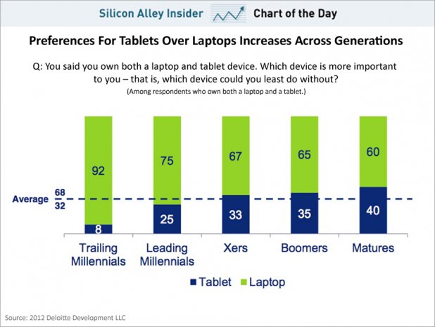 一份由 Deloitte 所調查的報告指出,如果要你選擇 Notebook 或平板,不同年齡層的用家究竟會有怎樣的選擇?從以下的圖表上可以見到,愈為年輕的用家,選擇 Notebook 的會較多,相信可能與 Notebook 可以做更多工作兼效能較好有關。而年長用家則不需要過於複雜的裝置,簡單的使用體驗及操作更為適合。小編認為調查結果十分合理,不少較年長的爸爸媽媽確實不太懂得使用電腦,平板就方便他們上網及遊戲,年輕人是喜歡使用平板,但原如連同年長用家計算,後者將會更加喜歡吧!