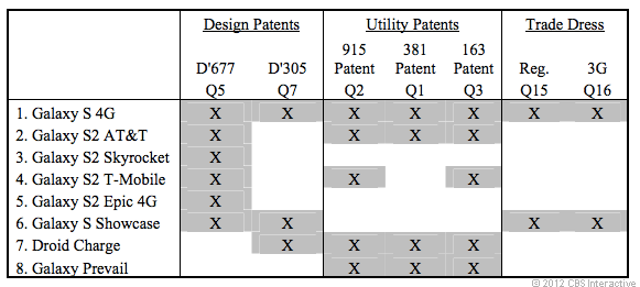 Aple 向法院申請禁售的 8 款手機分別是 Galaxy S 4G、Galaxy S2 AT&T、Galaxy S2 Skyrocket、Galaxy S2 T-Mobile、Galaxy S2 Epic 4G、Galaxy S2 Showcase、Droid Charge及Galaxy Prevail。以型號來看,其實只是舊有的 Galaxy S 及 Galaxy S2 兩款,只是由不同的網絡商銷售。是次申請禁售並未包括最新的 Galaxy S III 型號,但之前 Apple 表示 Samsung 共有 28 款手機侵權,所以不排除日後將會有更多手機會受到影響。