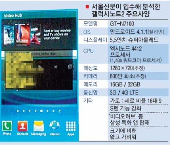 根據韓國傳媒,Galaxy Note 2將會用上Android 4.1.1系統,配備有5.5吋 1280 x 720解像度Super AMOLED屏幕;處理器方面則為四核Exynos 4412 1.4GHz。相機方面為8百萬像素,搭配16GB或32GB儲存。