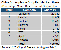 根據美國市場調查公司 IHS iSuppli 的調查報告指出,中國市場今年上半年智能手機的出貨量以 Samsung 佔有率最高,達 20.8%,其次是聯想、雙門、華為、Nokia、中興然後先到 Apple。Samsung 的出貨量約為 1,440 萬部,Apple 只有 520 萬部,只及 Samsung 的 1/3,其餘廠商也比起 Apple 的出貨率更高。