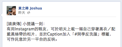 反對國民教育科開展的事件近日成為城中熱話,相信讀者們的Facebook、Instagram都充斥著各式各樣的文章轉貼、感想和圖片。早前學民思潮召集人黃之鋒號召Instagram用戶,在昨天上載一幅自己穿著黑衣或配戴黑絲帶的相片,並加入「#開學反洗腦」hashtag標籤。