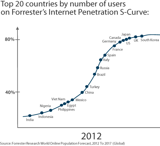 據市場調查機構 Forrester Research 最近公布的統計資料知道,24 億人曾經上網的計算是每月接觸 Internet 至少一次的用家,包括了電腦或流動裝置。以此推斷,到了 2017 年,世界人口將會有 74 億人,會有接近一半人口可以上網,統計資料已包含了 56 個國家。