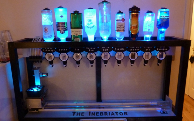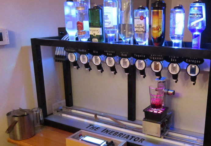 好多人鐘意飲 cocktail,尤其是姊妹們,有時想飲 cocktail 又懶得出街飲,自己又唔識調酒,飲唔到會好無癮。Inebriator 可以做你 24 小時的私人調酒師,它是一個機器,外表睇落就是一支支酒倒轉插好,把杯放在機上的座然後選擇想飲的 cocktail,個座就會走來走去收集所需的酒,然後加入 mixer,用 nitrogen-pressurized tubes 從冷卻器傳到杯,你想飲的 cocktail 就完成啦!
