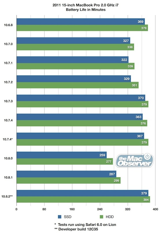在OSX 10.8 Mountain Lion推出之後,有不少用家投訴,MacBook系列手提電腦在系統升級之後,電池使用時間大幅減少了大概33%,在之後的10.8.1更新中,情況雖然有所改善,但是也未能回復至OSX 10.7 Lion時的水平。
