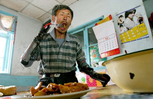 吉林省的 Sun Jifa 10 年前經歷了與漁船相關的爆炸,不幸失去了一雙手。醫院建議他裝上的義肢太貴,所以他就親自造了一雙手,這雙手透過他胳膊的運動操控滑輪和線,可以抓住和擠壓物件的手。造假手都不用假手於人,真是一個聰明又頑強的人。