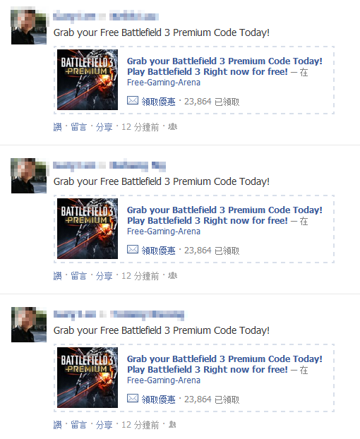 「優惠」功能可以讓公司輸入一個網址領取優惠,但對網頁本身沒有審查,所以今日就有人利用遊戲大作來作魚餌,「Grab your free battlefield 3 premium Code today.」引得現在有數萬人「中招」,如果進入頁面 Like 了該公司的 Facebook 程式後,就會不斷發出優惠給自己朋友,讓更多人中伏。所以見到「Grab your free battlefield 3 premium Code today.」,千萬不要按,更不要分享!
