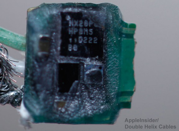 相片顯示疑似認證用的晶片在USB電源與V+綫中間,意味著沒有了這晶片或通過不了晶片的認證,當傳輸綫插入iPhone 5或新iPod時,電流將不會通過。分析指Apple可能藉此控制配件生產商,或將部份獨特功能以晶片作控制,只開放給Apple或合作伙伴的配件使用。