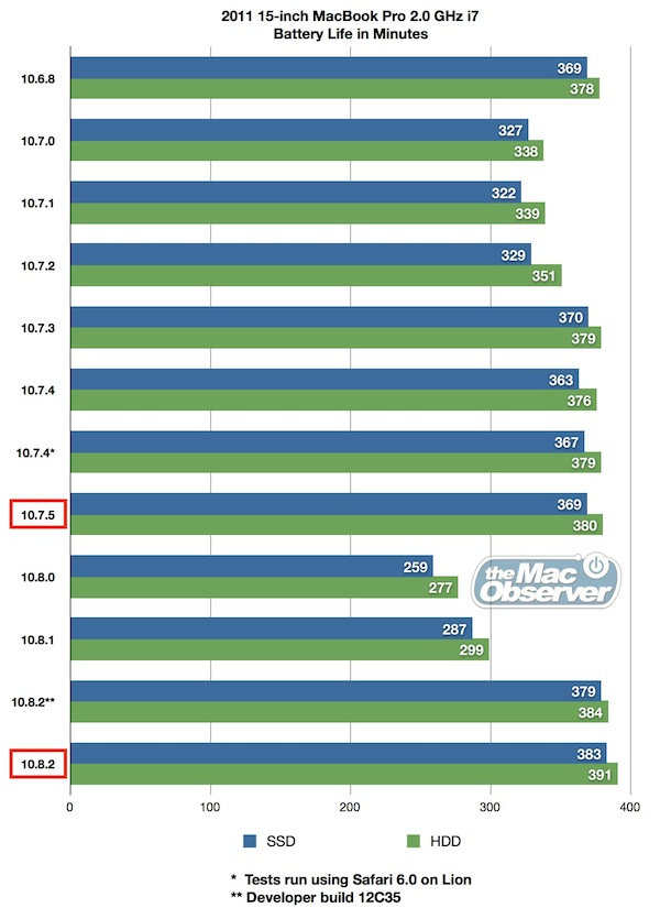 它以 2011 年款的 15 吋 MacBook Pro (使用 2GHz 的 Intel Core i7 處理器) 進行測試,當中包括使用 SSD 和硬碟下不同 Mac OS X 版本的電池續航力比較,當中 Mac OS X 10.8.2 的電池續航力比 Mac OS X 10.8.0 長 40%,十分誇張。升級到 Mac OS X 10.8.2 後,電池續航力已回到已往 Mac OS X 10.7 時代的水平。