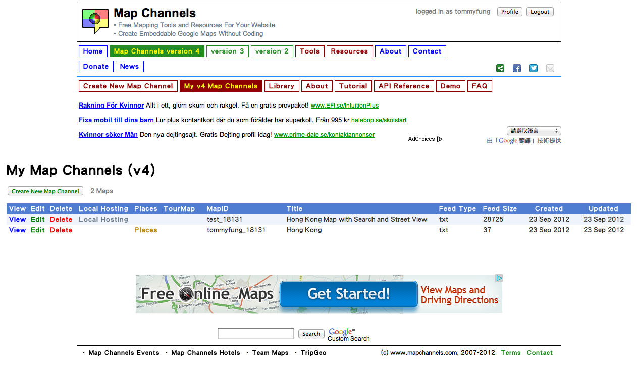 方法好簡單,先到mapchannels.com註冊。Map Channels是一個讓用戶製作個人化地圖的網站。登入後選擇Map Channels version 4,然後選擇Create New Map Channel,裡面根據指示即可製作個人化的地圖。由於Map Channels是免費服務,他們會在地圖右下方加入Google廣告,佔去畫面的位置,用起來十分不便;但只要將設定好的檔案,寄存在用戶自己的伺服器即可將廣告移除。