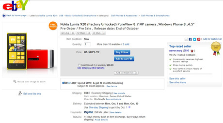另外 eBay 日前有用家拍賣 Lumia 920 的預售機,價錢為 899.99 美元,並表示會於 10 月 1 至 15 日送貨,比起 10 月底正式推出日期還要早一點,如果用家想搶先試用,價錢還是可以接受,但 Lumia 920 並不是 iPhone 5,不知道會有多少有興趣會提早試用呢?