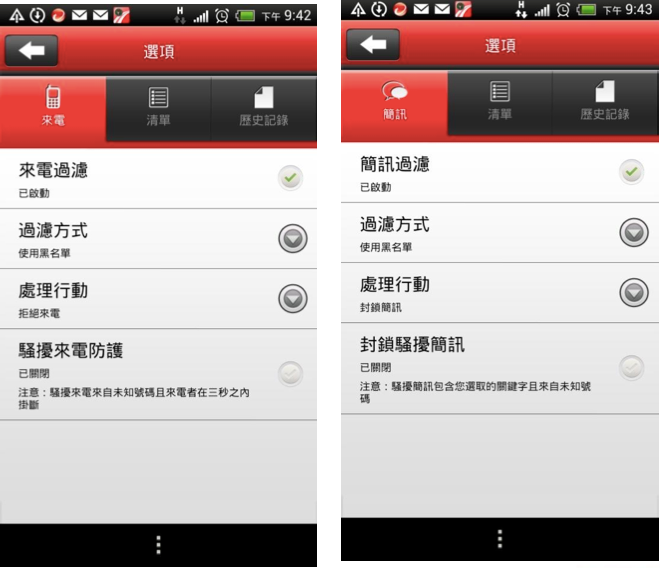 在「來電過濾」中可封鎖惡作劇電話或拒接電話,另可透過「簡訊過濾」封鎖包含特定關鍵字的簡訊,它亦有黑、白名單設定方式,可設定封鎖或允許來電、簡訊的電話號碼清單。