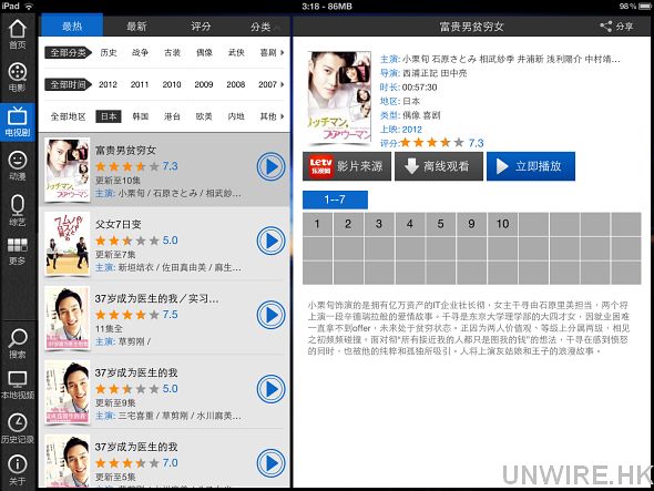 它有 iPhone 和 iPad Apps 兩個版本,均可在香港 App Store 免費下載得到,截稿時在電視劇頁面內仍可找到日劇分類,筆者亦成功用它看今季新劇。