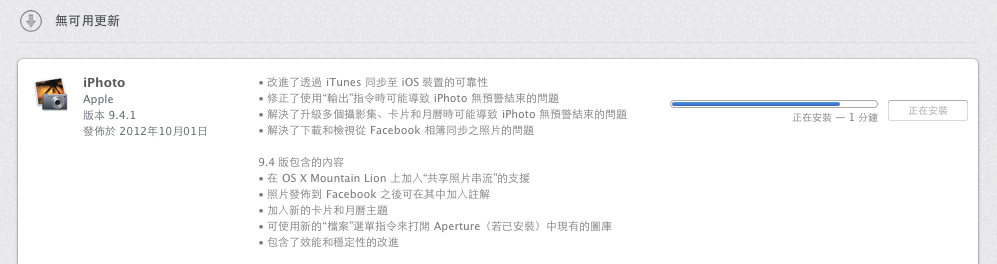 Apple 剛為 iPhoto 11 用戶推出 iPhoto 9.4.1 更新,該更新修正了多項問題,包括使用共享功能時 iPhoto 自動關閉、iTunes 和 Facebook 的同步問題等。Mac OS X Mountain Lion 用戶可在 Mac App Store 進行更新,舊系統用家就可在「軟體更新」進行更新。
