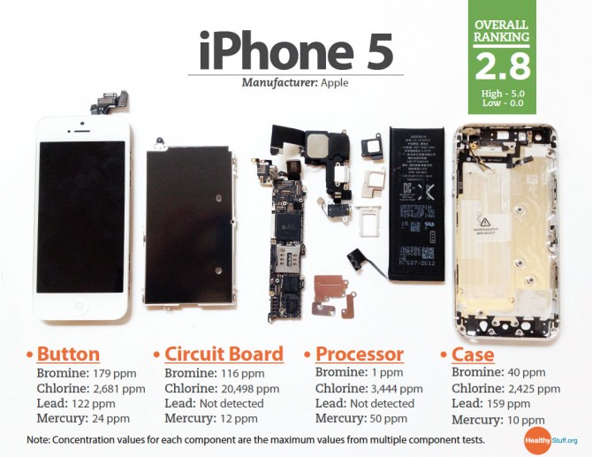 大家除了關注手機幅射外,對於環保人士來說,用料所含的化學成份也同樣重要。iFixit 聯同 Healthystuff 網站就對市場上 36 部熱門手機作出分析,原來 iPhone 5 及 iPhone 4S 已算是較為少有毒害的化學成份。