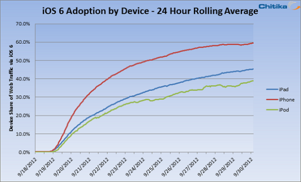 根據廣告市場分析公司 Chitika 日前所公布的統計數字指出,iOS 6 在美國及加拿大等地的北美地區已有不少用家升級,在頭 24 小時內升級比率達 15%,其中以 iPhone 用家的升級比率最高,目前已達到 60%,不少用家希望可以享受到最新的 OS 版本。Chitika 亦表示,相比起 Google 最新的 Android 系統,只有 22% 用家已升級至最新的近兩個版本,如果計算 Android 4.1.1 相信數值會更低。