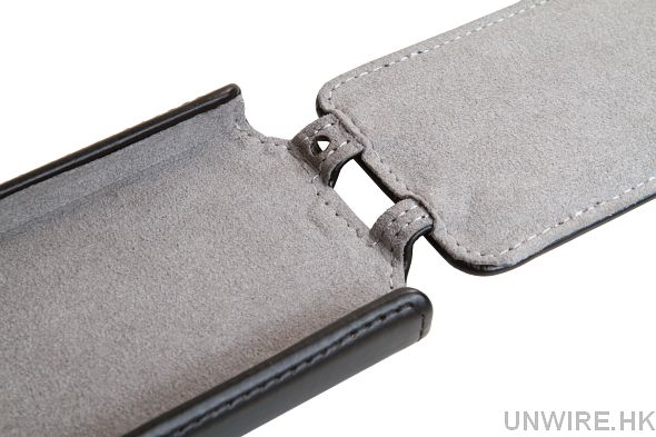 這款機套最特別的地方是,背蓋位置有藏有卡片套,供你放置八達通和名片等,該獨特設計令它和錢包二合為一,該卡片套以熱熔式人手熨壓製作,可靠耐用,值得一提的是它所用的物料容易清理,只需輕輕一抹即可去除污跡,是它比其他皮套優勝的地方。現有黑、藍、紫三色供選購。