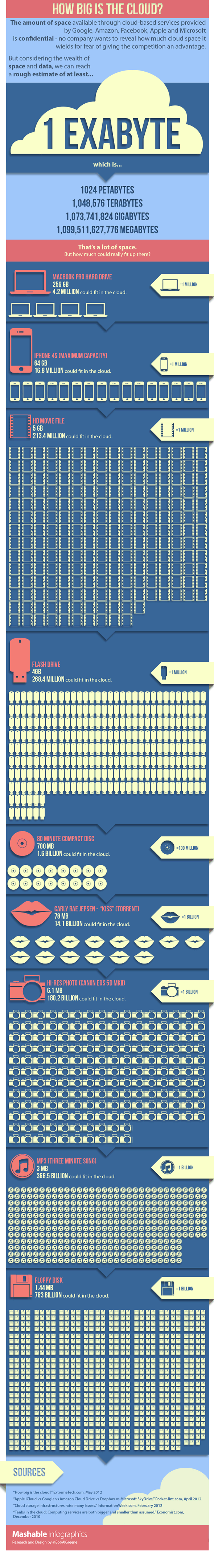 現時 Google Drive、Dropbox、iCloud、SkyDrive 等雲端儲存愈來愈多人使用,透過 Internet 上傳及下載不同檔案,亦可以作為分享用途。全世界的網民收以十億計,有不少網民也會使用雲端儲存,雖然容量可能不足以與你電腦內的儲存容量比較,但實際上仍然十分龐大,究竟其容量有多少呢?大家看看以下圖表就會知得一清二楚。