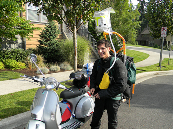 Gabriel Paez 可以算是一個人做的 Google 街景服務,全景攝影師及 iPhone 黑客由俄勒岡州的海邊橫跨美國緬因州的波特蘭,駕駛着 2005 Vespa PX150,他背上綁上了巨大的全景攝錄裝置,可以 360 度拍下他冒險的足跡 “for a live stage show”。