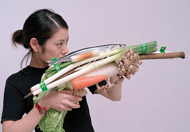 小妹想為大家介紹一下這些由日本人發明的武器,聽到「武器」兩個字就覺得可怕?日本攝影師小澤剛的一個攝影 “Vegetable Weapons” 展示了用蔬菜和其他食物整成的槍,他由 2001 年起已經去到世界各地拍攝年輕女性拿着這些槍的相片。他叫被拍攝的人拿出一堆當地原產的火鍋用配料和蔬菜,然後他們把食物砌成槍形叫模特兒拿起拍攝,完成拍攝後他們就一起把這些美味的武器吃掉。