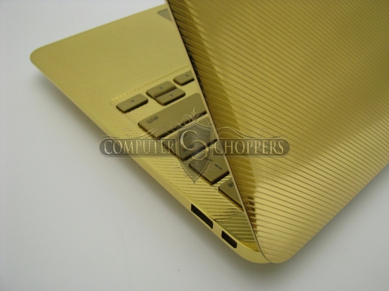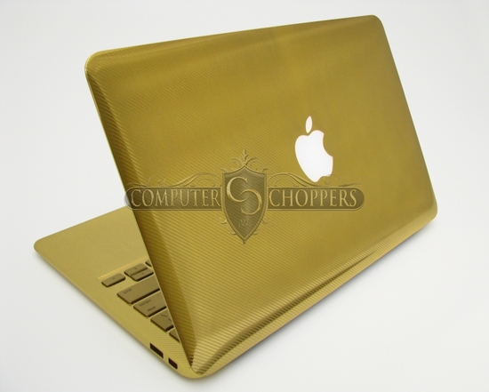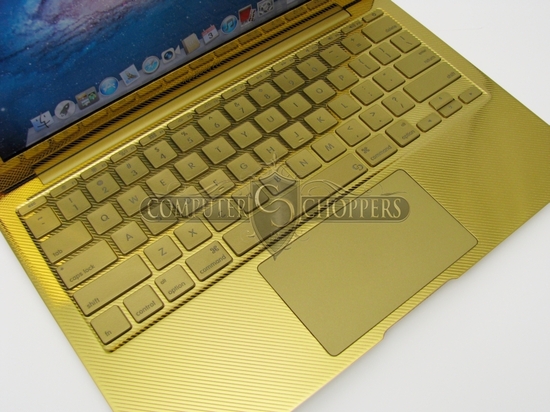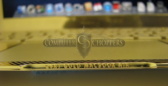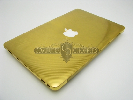早前 iPhone 5 也有 24K 金版本出現,現在就到 MacBook Air!今次 Computer-Choppers 推出的 24K 金 MBA 有 11 吋及 13 吋兩款選擇,售價分別為 7,500 美元及 8,500 元起跳,成本視乎用家自訂的需要而定,需時 3 至 4 星期製作。除了 24K 金外,Computer-Choppers 亦可以利用其他物料為你炮製「獨一無二」的 MBA,鍵盤也可以配搭其他顏色,另外還有 27 吋 iMac 等也可以度身訂造,認真誇張!