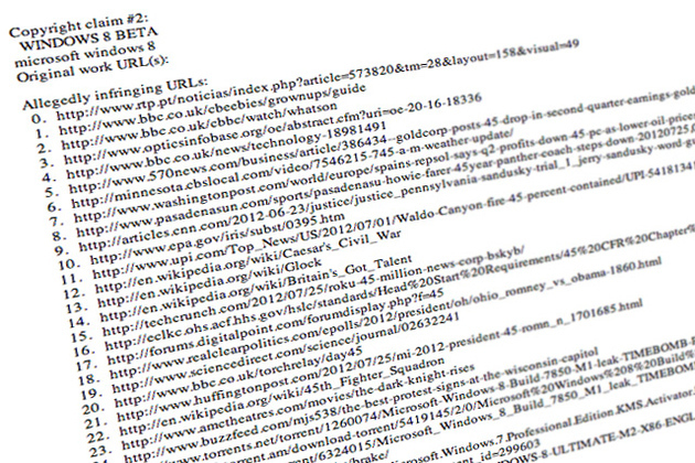 這批「侵犯版權」的網站中,包括了BBC News、TechCrunch、BuzzFeed、Wikipedia、AMC Theatres,甚至美國政府的網頁,原因是侵犯了「Windows 8 Beta」的版權。這很明顯就是程式出錯弄出來的笑話,不過Google方面也很機械式的把這名單處理掉,除了部分如BBC News和Wikipedia等可能因為出現在白名單上而不受影響,但AMC Theatres和Real Clear Politics則要人手解除。自動化的東西,都不太可靠啊。