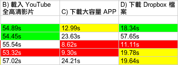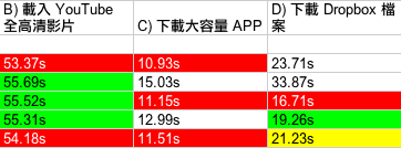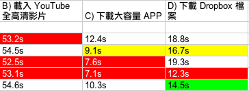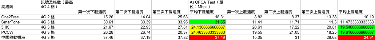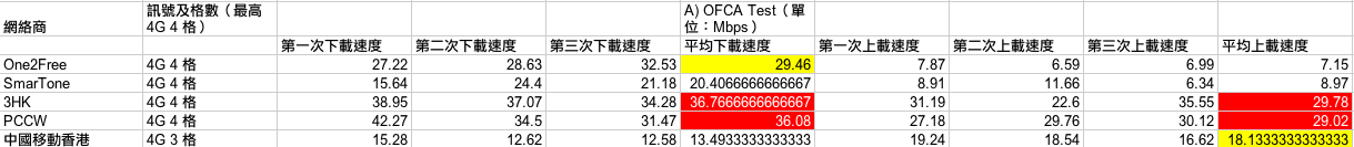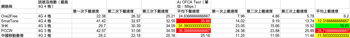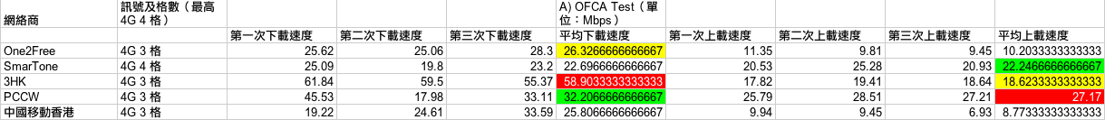 測試開始!(下方測試結果列表會以顏色標示第一、二及三排名,紅底白字為第一、綠底黑字及黃底黑字分別為第二及第三。至於決定排名方面,OFCA 測試中,如果兩台平均速度相差少於 1Mbps,將會被算為表現相同;而其他三項測試,如果時間相差少於 1 秒,表現亦會被算為同級。另外,如果有兩個台排名相同,就會撤銷對落排名,例如:如果有兩個台在測試點取得雙冠軍,就會沒有了亞軍,對落最接近表現的台就會取得季軍。還有一點,每個測試點判斷哪個台取勝的先決條件,主要在於實際應用的 3 個測試,亦即是 YouTube 高清影片載入、高容量 App 下載及 Dropbox 檔案下載,OFCA 速度測試方面,一來由於網絡商較易「做手腳」,二來不夠生活化,所以結果只作參考用途。)