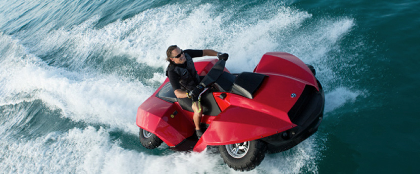 GIBBS Quadski 由 2006 年開始已經有雛型,現在好快於市場上見到啦!這是一架好型的水陸兩用車,在陸地上時是一輛四驅車,在水中就會收起它的輪子,變成噴射式像滑雪板一般的裝置,變身過程是需 5 秒。