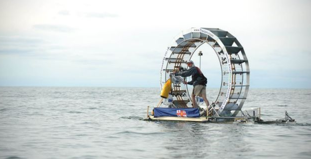 小時候養倉鼠最喜歡看牠們玩輪式的跑步機,覺得好得意呢!35 歲的 Chris Todd 看來都很喜歡玩這款跑步機,他踏著一架叫 Tredalo — 像倉鼠輪一樣的巨型筏子,嘗試「走」過 106 公里的海洋。他計劃從威爾斯穿過愛爾蘭海到達南部的都柏林愛爾蘭的東岸,但可惜沒有成功,因為惡劣的天氣,他遇到船舵的問題,被逼於出發後大概 8 個半小時,走了 42 公里後停下。