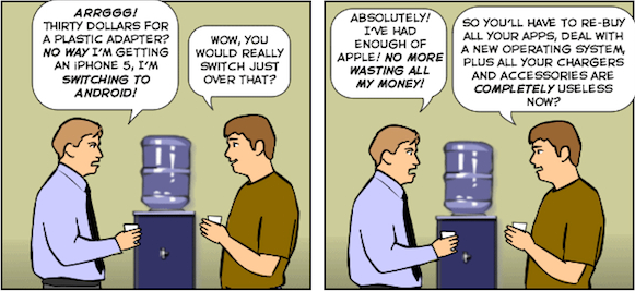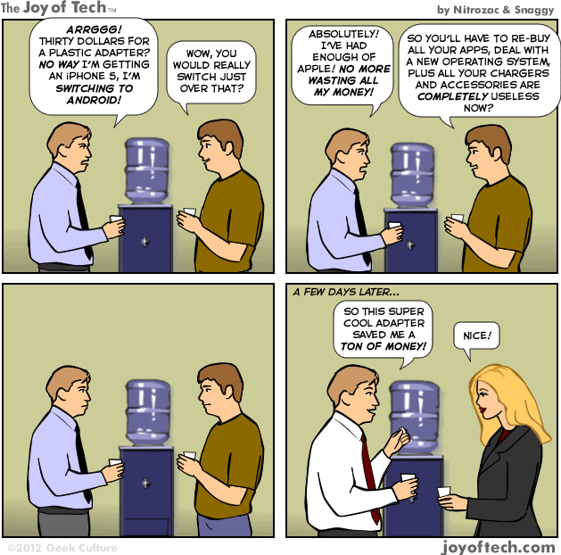 有好多人因為 iPhone 5 轉了新的 Lightning 充電頭覺得好煩惱,令好多線、配件變得無用,所以 Apple 都出了轉插器,但要 30 美元一個,平息不了用家們的怒火。Joy of Tech 就用這個主題創作了一篇漫畫,這 30 美元值得付嗎?