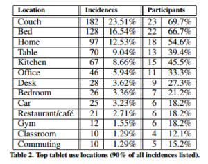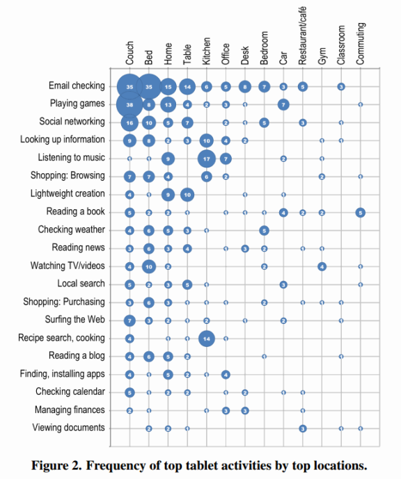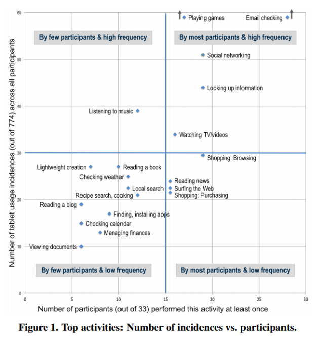 在 Google 的最新研究顯示,以 33 名美國平板用家為對象,有 13 名為男性用戶,20 名為女性,年齡範圍為 18 至 70 歲,其中 24 名為 iPad 用戶,9 名使用 Android 平板,並在 2011 年 9 月至 10 月期間作出統計,統計他們在日常生活中使用平板的次數,從而得出數據。