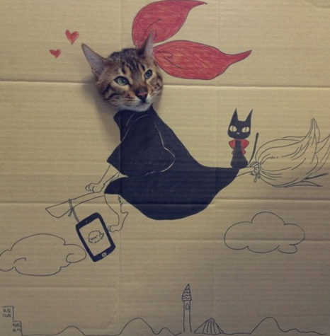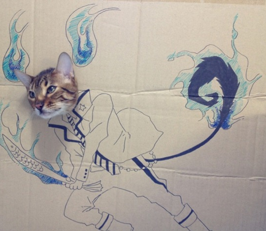 她在紙皮上畫上不同漫畫人物的身體,在漫畫人物的頭部開口,再加上貓貓非常配合的表情,使照片效果幽默有趣,貓貓都可以 cosplay。