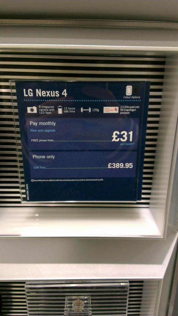 LG Nexus 4 快將推出,其售價一直未有公布。日前英國就有商店公開了淨機價格,沒鎖版本為 £389.95,比起上年 Galaxy Nexus 推出時需要近 £480 更為便宜。