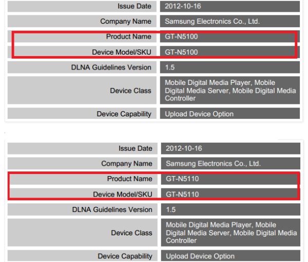 Samsung 在平板市場已有 Galaxy Tab 系列,由 7 吋至 10.1 吋均齊備,但面對著平價的 Nexus 7、Kindle Fire HD 及 iPad mini 等平板,需要重整策略去應付市場需求。最近在 DLNA 認證網站上就有 Samsung GT-N5100 及 GT-N5110 的蹤影出現,應該是 3G 與 Wi-Fi 版本的分別。現時 Galaxy Note II 的型號為 GT-N-7100,Galaxy Note 10.1 為 GT-N8000 及 GT-N8010,GT-N 代表了是 Galaxy Note 系列,消息指這兩款產品會是 7 吋大小的 Galaxy Note 平板,採用與 Galaxy Note II 相同的四核心處理器、還會有 HD 屏幕等等。