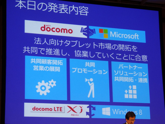 NTT DoCoMo CEO Kaoru Kato 表示,只要為平板加上 Xi 功能(即 LTE 連線),他相信 Windows 8 的優秀可用性及豐富功能可以為企業客戶提供完美應用配搭,並預計可以有 20% 的年增長市場。目前除了 Panasonic 的 “Let’snote AX” 外,NEC、Fujitsu、Toshiba 及 HP 等也會跟據,將會有相關產品推出。