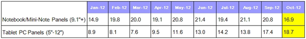 根據市場調查機構 NPD DisplaySearch 的最新報告指出,今年 10 月平板所採用的面板付運量達到 1,870 萬片,比起 Notebook 面板數量只有 1,690 萬片還要多約 180 萬,亦是首次超越後者。除了平板有更大的市場需求外,因為 Notebook 要轉用新設計以配合 Windows 8,所以對於面板的採購數量略減。