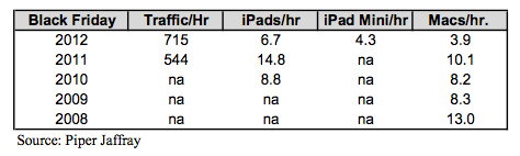 另外他們用了 5 年時間觀察 Apple Store 在相同日子下的銷售情況,發現購買 iPad 及 Mac 機的顧客減少了,但仍然比起上年多出 31% 人流,不少也是購買 iPad mini 居多,不過 iPad mini 貨源不足。