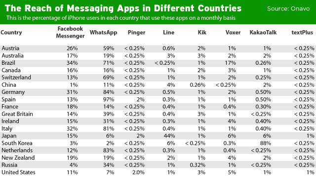 根據統計公司 Onavo 的最新數據顯示,Whatsapp 在大多數的歐洲國家最為盛行,普遍有七八成以上佔有率。至於北美、澳洲等地則比較溫和,Facebook Messenger 與 Whatsapp 相差不算太遠,只有加拿大及新西蘭能夠與 Whatsapp 平起平坐。至於近年最為積極的 LINE,只有日本較為受歡迎,佔有率達 44%,反而 Facebook Messenger 還比起 Whatsapp 的佔有率更多;而韓國則有類似情況,其本地的 KakaoTalk 也大幅度超越其他同類應用,更達 88% 之多,可見日本及韓國大多支持自己的產品。整體而言,Whatsapp 仍然有最高的佔有率,除了歷史較為悠久外,其佔有資源較少及反應較快亦是其優點。不過統計並未有國內受歡迎的 WeChat,在香港最為常用的,相信也只有 Whatsapp、LINE 及 WeChat 三款吧!
