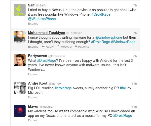 事緣Microsoft希望藉著@WindowsPhone Twitter戶口,去踩Android手機有malware(惡意軟件);Microsoft呼籲網民張貼Android被Malware襲擊的恐怖事件,並加上#DroidRage tag。Microsoft更會送出Windows Phone與張貼者。