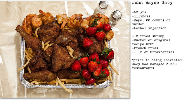 John Wayne Gacy 熱心公益和社會服務,表面是一個模範青年,但曾虐殺 33 名青少年。他要求以一桶肯德基、12隻炸蝦、薯條及 1 磅士多啤梨作最後晚餐。他最後說的是 “Kiss my ass”。