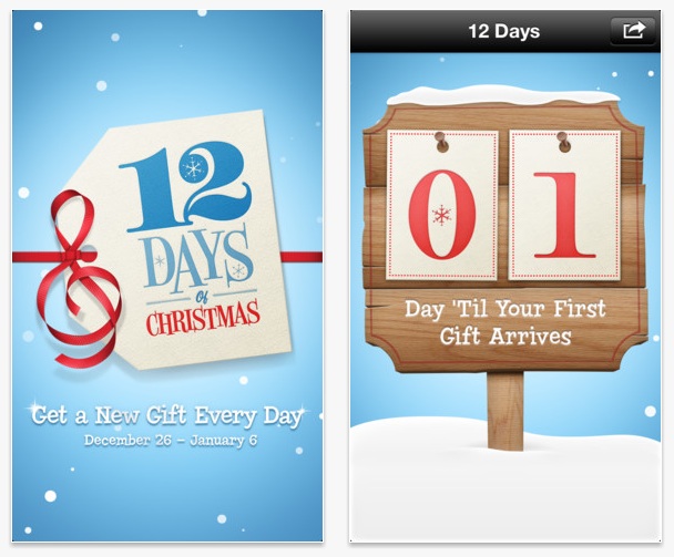 Apple每年都會推出「12 Days of Christmas」App,在聖誕節後連續12天,每天都會有一個免費的iTunes小禮品。 由12月26日至1月6日,每天Apple都會透過「12 Days of Christmas」送出iPhone、iPod和iPad適用的Apps、音樂、MV和電視、書籍。讀者們有興趣的話,可到iTunes AppStore下載。用戶亦可以透過Twitter,跟好友分享這個免費App。
