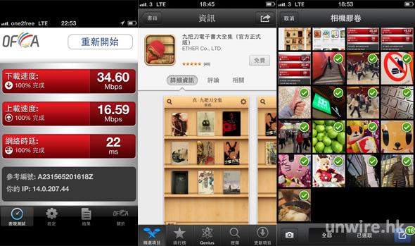- 測試方法:OFCA 測試各三次、Facebook 上傳 16 張共 30MB iPhone 5 相片各三次、App Store 下載 31.3MB 的免費《九把刀電子書大全集》各三次。