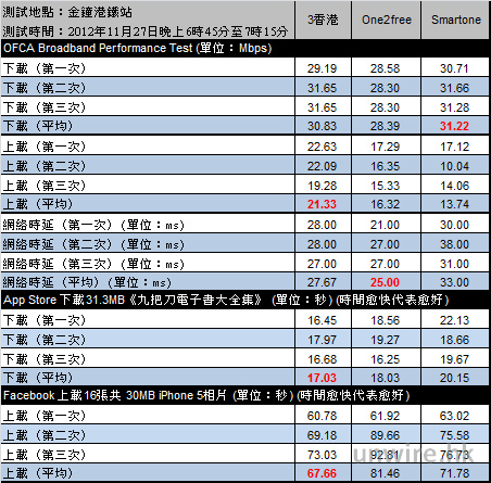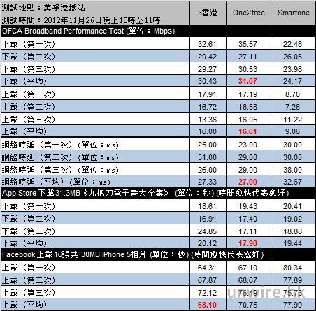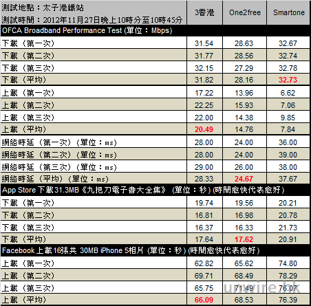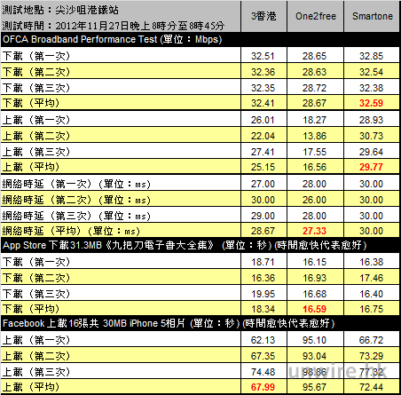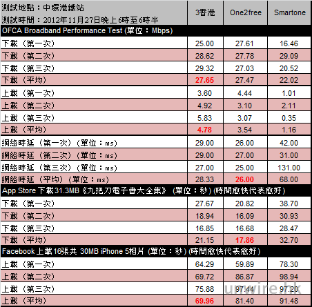 除了 One2free 在 App Store 的下載時間較為快速外,其餘測試以 3HK 佔優,平均速度最好。但在港鐵中環站最為明顯的是,三間供應商的上載速度表現會較其他港鐵站更慢,要知道一般標示的速度快慢均以下載為主,宣傳中上載速度實際上是沒有提及的。由於港鐵中環站的人流極高,避免個別客戶佔用太多頻寬一般也會採用此方法去節省流量。其實上載的比率的確較下載低得多,所以也是情有可原的。
