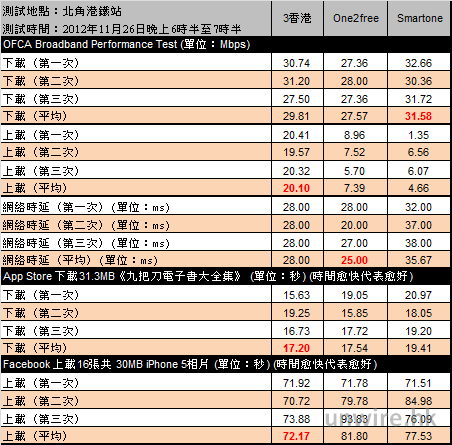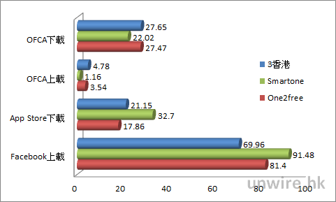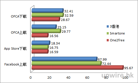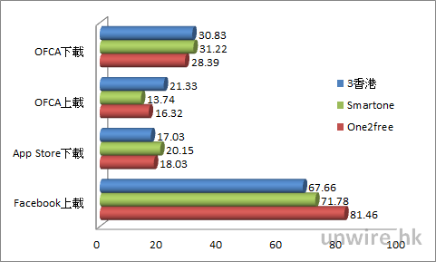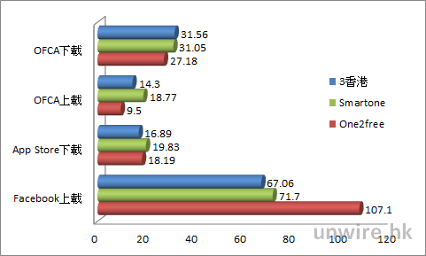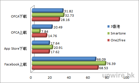 整體上亦是以 3HK 速度較為領先,基本上各方面均佔優,只有整體上載速度及不上 SmarTone。One2free 則幾乎各項測試均包尾,因為上載速度較慢,可以見到 Facebook 上載相片的時間亦慢上許多,而網絡時延略遜於 3HK。