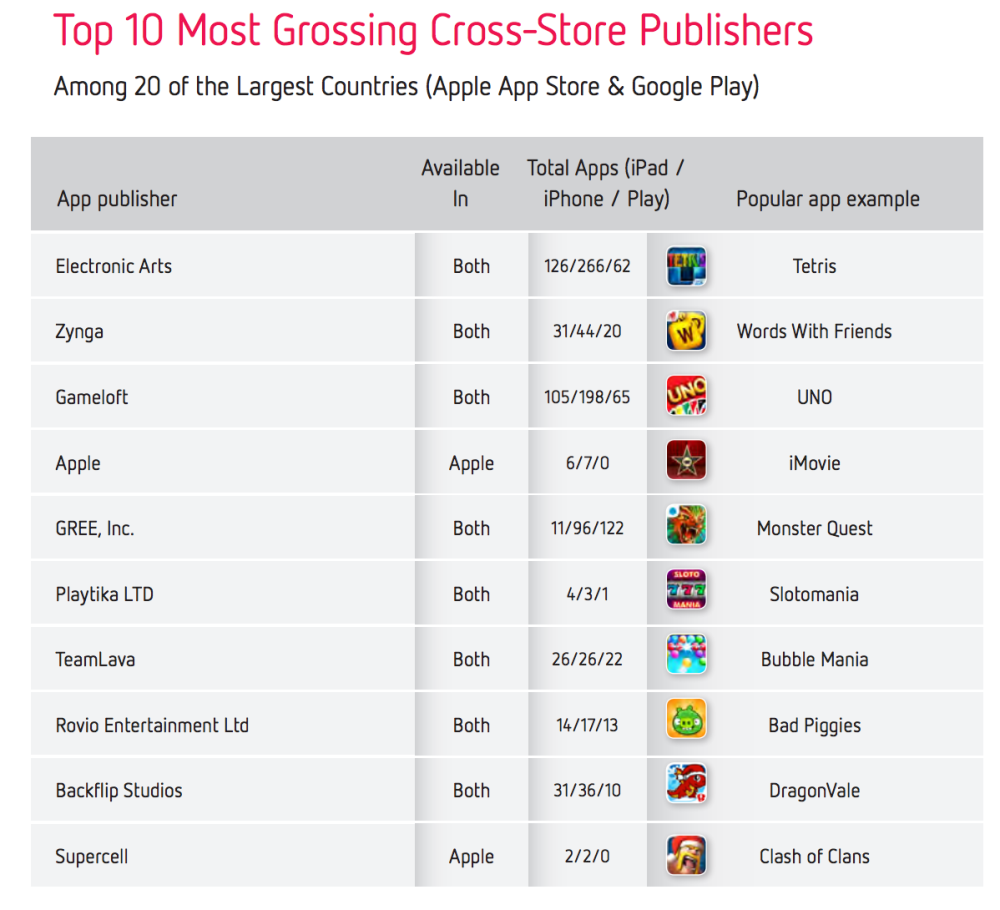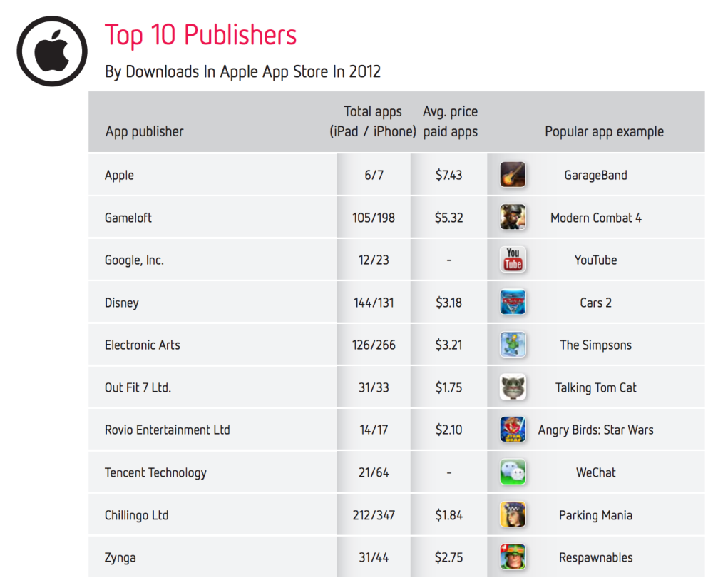 除收入外,Distimo 還在多方面作出統計及比較。如 App Store 與 Google Play 的頭 10 間開發商統計,遊戲商 Electric Arts 成為榜首,亦有 iPad、iPhone 及 Android 的所佔比例;至於 App Store 上的 10 大受歡迎 App 及開發商亦有資料,整體上最多人下載的是 Apple 自家 App,iPad 及 iPhone 各自有 6 至 7 款,但仍勝過 Gameloft 的百餘個 App 總數目。