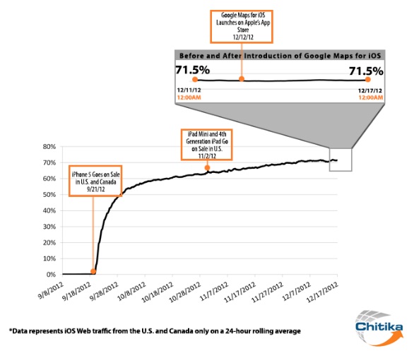 MoPub 搜集全球數據,指 iOS 6 使用率在 Google 地圖 App 推出後急升 29%,指 Google 地圖幫了 Apple 一把,然而當廣告分析公司 Chitika 研究 Google 地圖推出後 1 星期,美國和加拿大的 iOS 6 使用率時,就發現使用率沒有改變,維持在71.5%。