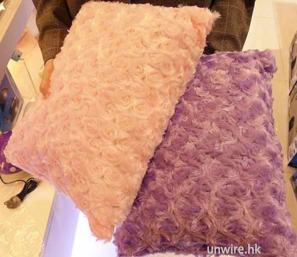 椅背墊體積 24 x 32 x 9cm,表面由毛毛組成玫瑰圖案,暗暗的圖案頗優美呢!分別有紫紅及玫瑰淺紅兩色,姊妹們可為辦公室扮靚靚,加上不時抱抱它都好舒服呢!